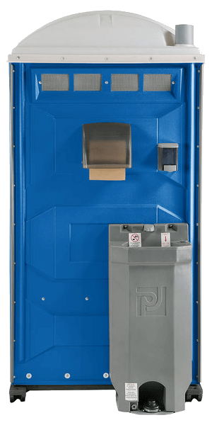 This type of deluxe porta potty is the most common. It has a toilet that flushes, a sink, a mirror, and a place to put hand sanitizer. Some models also have heating and air conditioning.